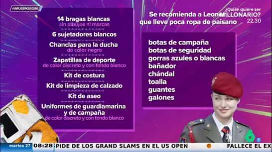 El primer punto de la lista pilla desprevenido a Alfonso Arús. "¡Uy! ¿14 bragas blancas?", exclama sorprendido. "Y hay que compensar con seis sujetadores blancos, chanclas para la ducha de color negro -hay que diferenciar bien la braga de la chancla-, zapatillas de deporte de color discreto y fondo blanco, kit de costura, kit de limpieza para el calzado -que como es blanco, se va a 'enguarrar'-, kit de aseo, uniformes de guardiamarina, de campaña, ignífugo y de faena azul, botas de campaña, botas de seguridad, gorras azules o blancas, bañador, chándal, toalla, guantes, galones y se recomienda que no lleve demasiada ropa de paisano", detalla Tatiana Arús.