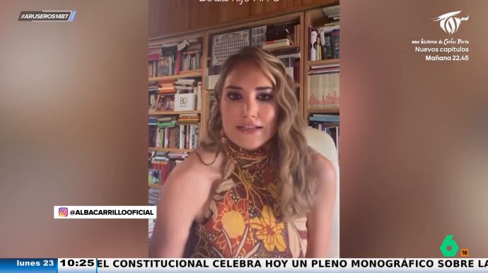 Alfonso Arús enseña en este vídeo de Aruser@s un "maxiresumen del zasca de Alba Carrillo a Ana Rosa Quintana". "Voy a dar una clase de moral y ética a Ana Rosa Quintana", afirma la modelo, que explica que este fin de semana se ha casado por segunda vez "su primogénito": "Ese primogénito que también se estaba enrollando con otra persona estando casado en esa fiesta en la que me grabaste a mí".