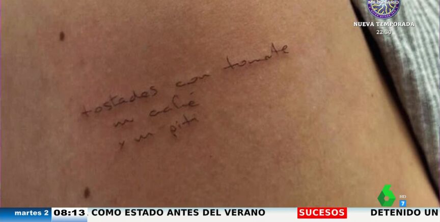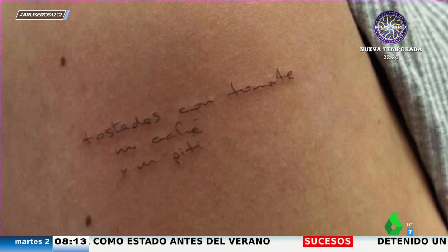 Alejandra Rubio ha desatado todo tipo de comentarios tras su último tatuaje, en el que se puede leer la siguiente frase: 'Tostadas con tomate, un café y un piti'.