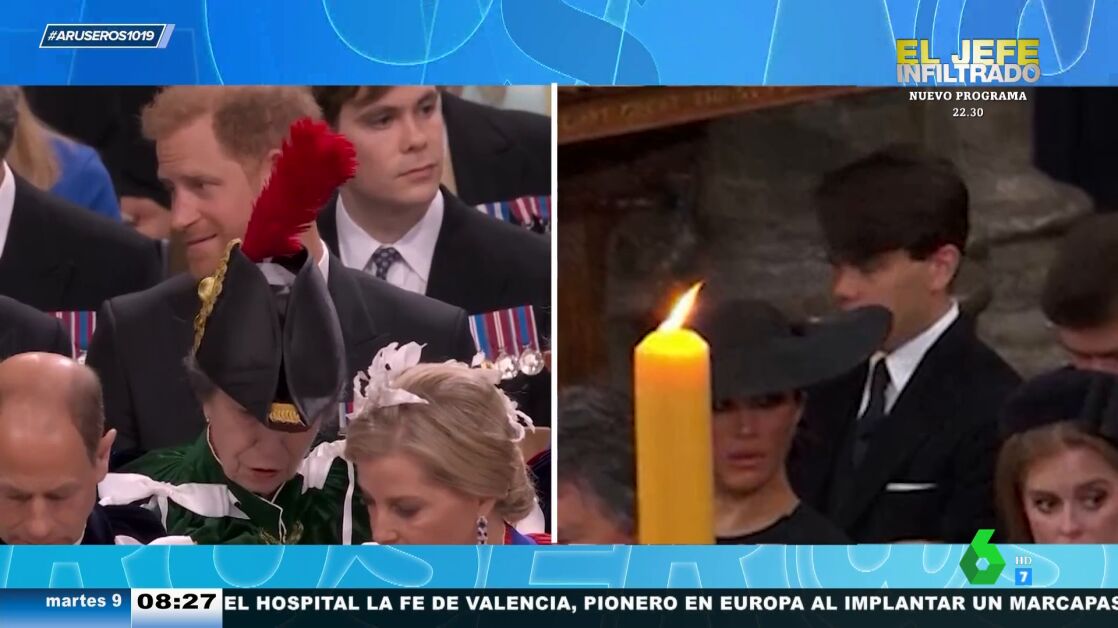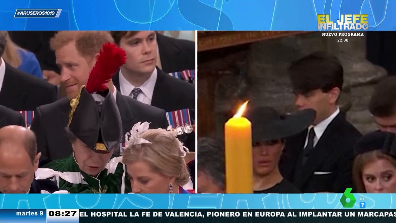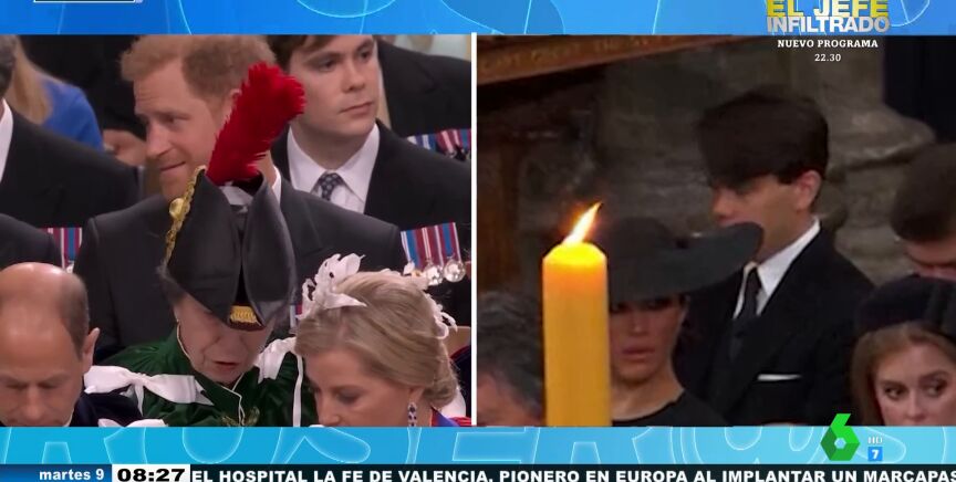 "Durante el funeral de la reina Isabel II había una vela que tapaba a Meghan Markle y en la coronación tenemos un sombrero que tapa a Harry", destaca Alfonso Arús en el plató, donde Angie Cárdenas detalla que a Harry le tapa a su propia tía.