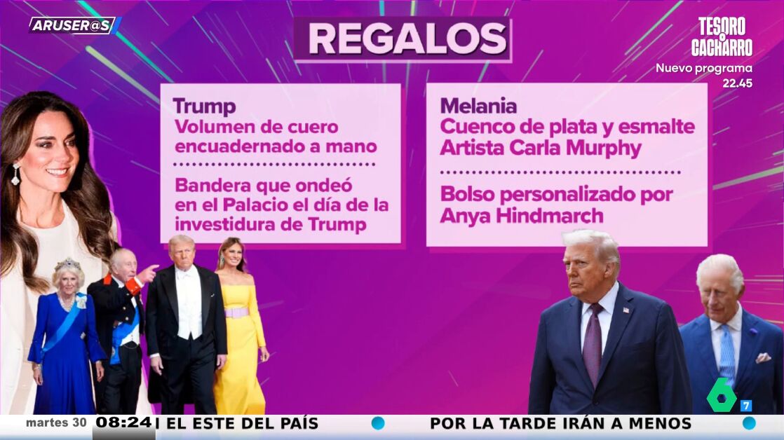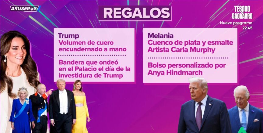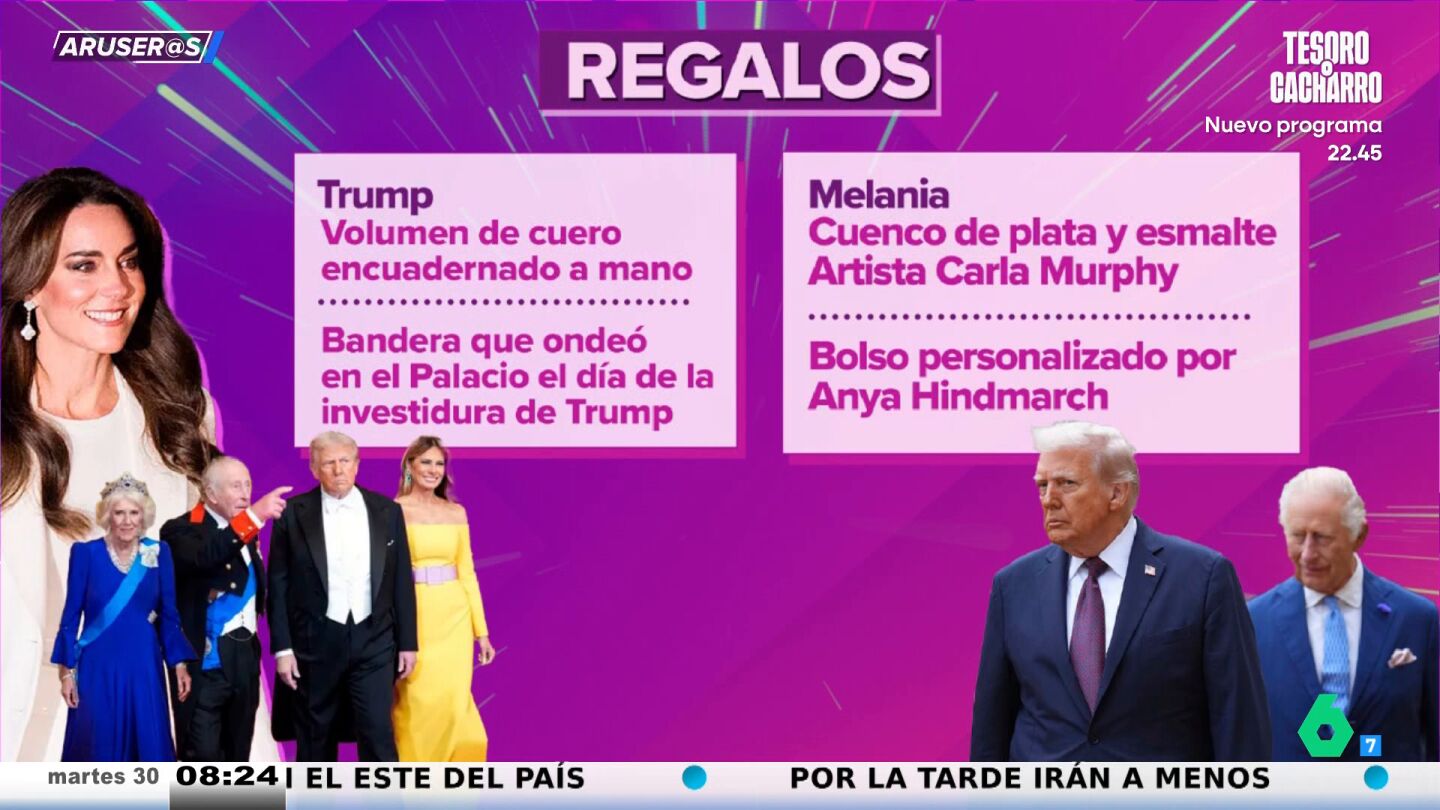 Tatiana Arús desvela en el vídeo principal de esta noticia los regalos que se hicieron los Trump y la casa real británica durante la visita del presidente de EEUU y su mujer a Reino Unido. Por ejemplo, Donald Trump recibieron de manos de Carlos III un volumen de cuero encuadernado a mano y la bandera que ondeó en el Palacio el día de la investidura de Trump.