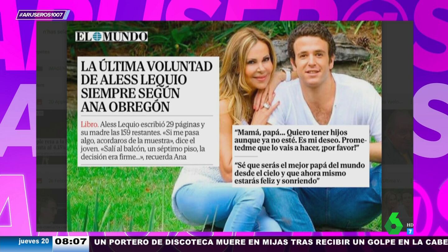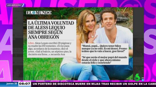 "Te lo ofrecen así", desvela el presentador, que cuenta cómo a él se lo han ofrecido: "A mí me ha pasado, me han dicho varias veces si no tenía que hacer nada, que escribiera mis memorias y ya me lo hacían". Por otro lado, Tatiana Arús cuenta las conmovedoras palabras que Aless Lequio habría dicho a sus padres antes de fallecer y que ahora salen a la luz con el libro: "Mamá, papá, si me pasa algo, acordaos de la muestra que dejé en el laboratorio de Nueva York, quiero tener hijos, aunque yo no esté, es mi deseo, prometedme que lo vais a hacer, por favor".