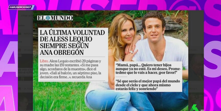 Este miércoles ha salido a la venta el libro de Ana Obregón sobre su hijo Aless Lequio. Se trata de un libro que habría escrito su hijo y que, tras su fallecimiento, se encargó de terminar la bióloga. "Eso en el supuesto de que lo ha escrito Aless", destaca Alfonso Arús, que confiesa en el plató de Aruser@s que no le convence: "Conozco a muy pocos famosos que escriban su libro".