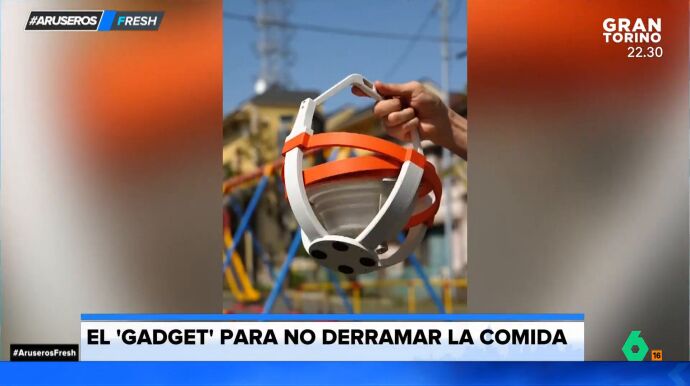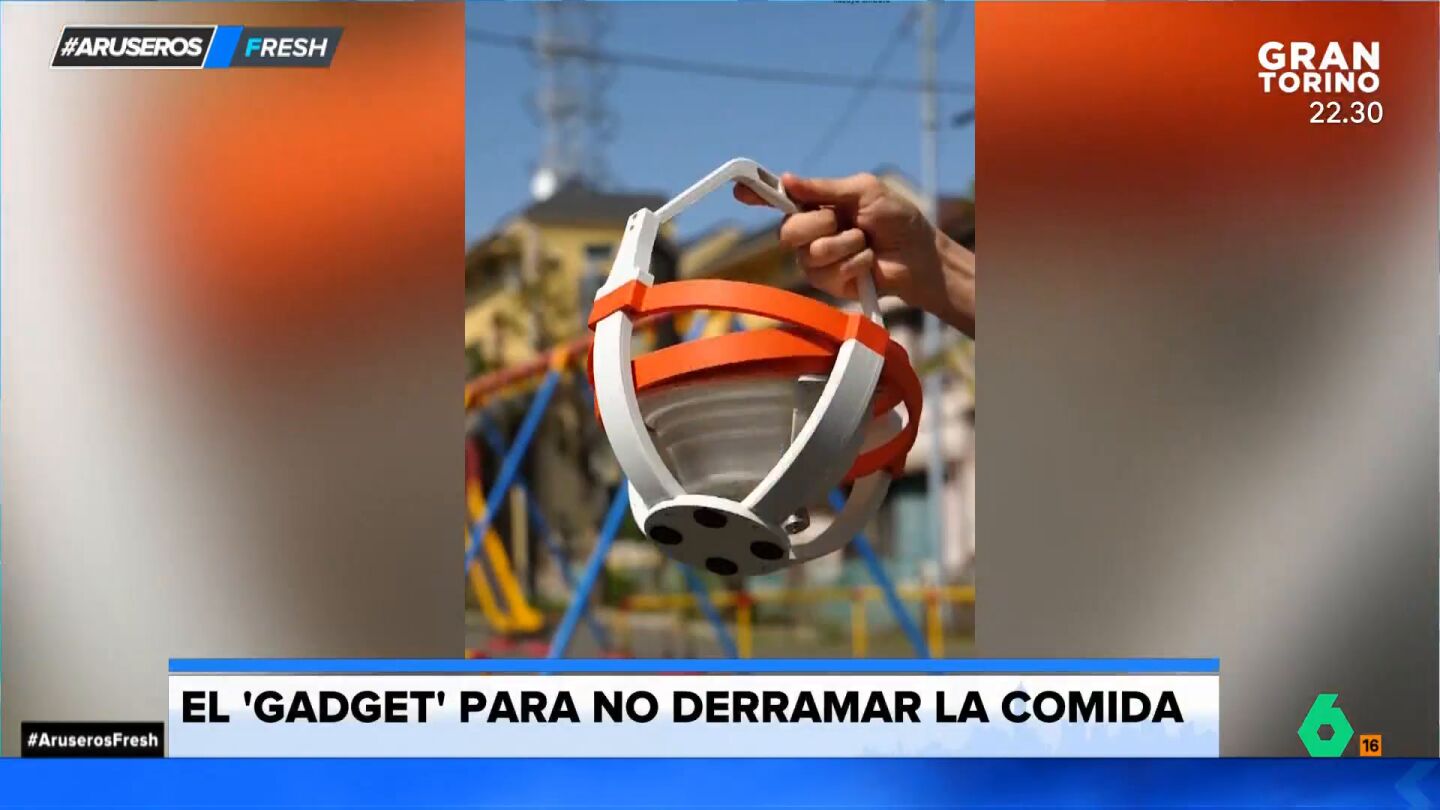 Alfonso Arús mostró a los tertulianos de Aruser@s el invento de un hombre para evitar derramar la comida cuando se transporta. En el vídeo, se puede ver la estructura en la que el hombre deposita un plato y lo mueve para demostrar que no se cae nada. El truco está en que la cesta lleva un sistema que hace que a pesar del movimiento, el plato nunca pierda el eje central.