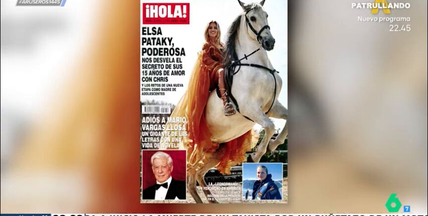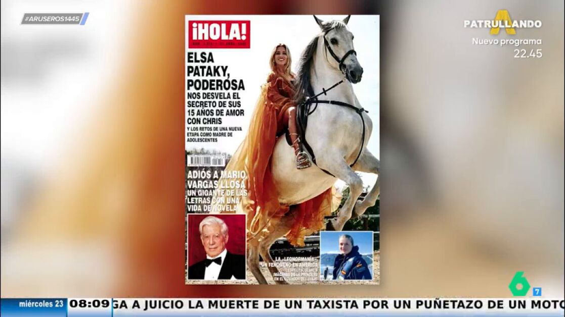 Por su parte, tanto Angie Cárdenas como Tatiana Arús muestran su sorpresa y recuerda que "durante muchos años Vargas Llosa fue protagonista de extensos reportajes en la revista": "No lo acabamos de entender". Es más, el presentador de Aruser@s alucina con la portada de Vargas Llosa: "Mirad la ventanita, parece que está a punto de ser pisado por el caballo de Elsa Pataky".