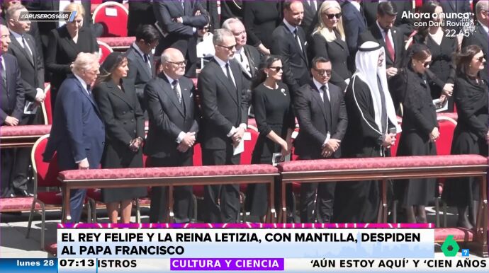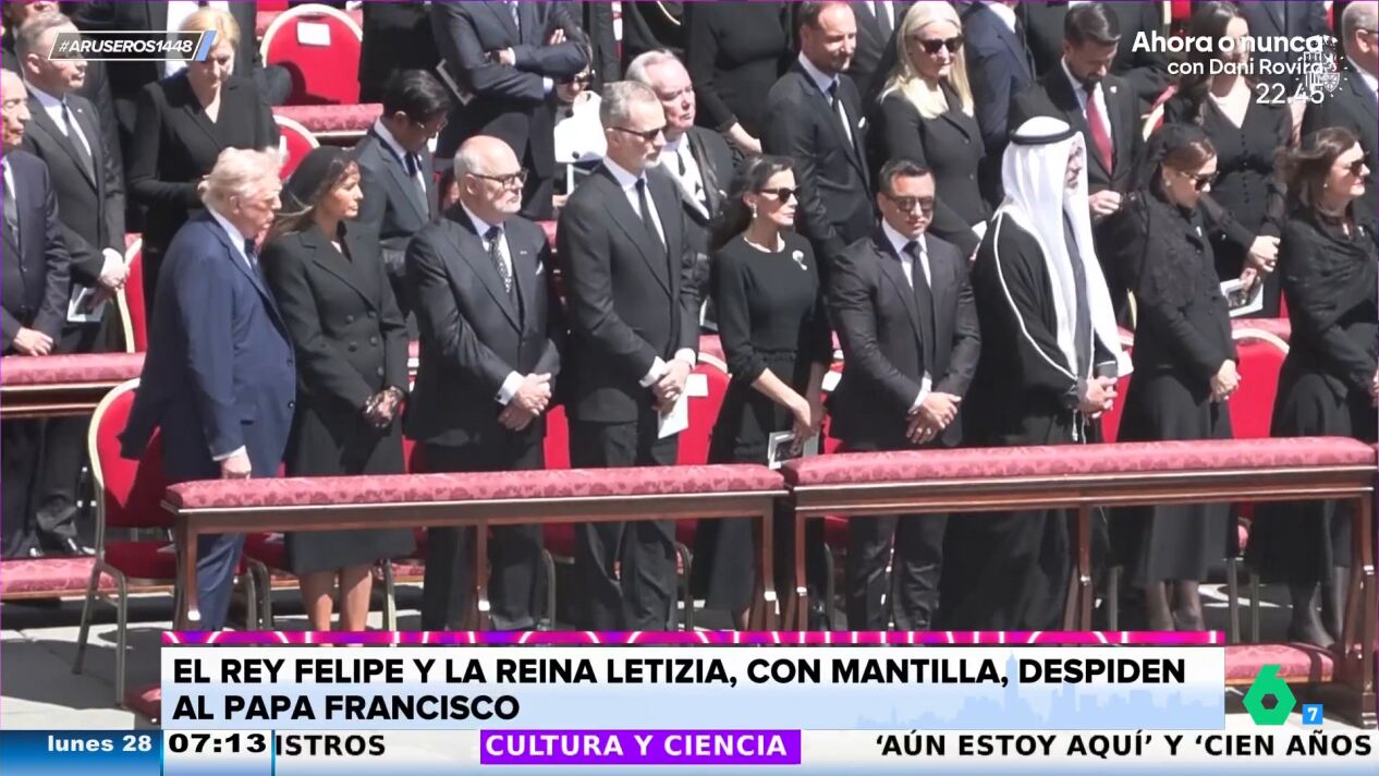 El rey Felipe y la reina Letiziahan despedido al papa Francisco junto al resto de casas reales y de políticos. "Los reyes de España fueron de lo más solicitados", destaca Tatiana Arús, que muestra en el vídeo principal de esta noticia cómo desde Mary de Dinamarca a Emmanuel y Brigitte Macron les saludaron.