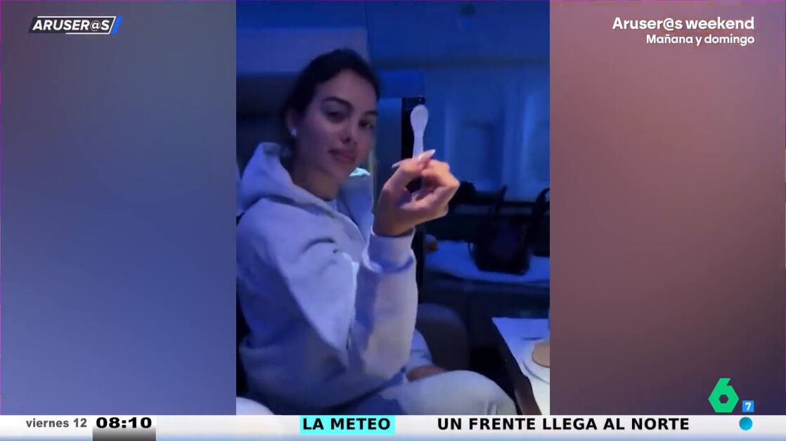 Georgina Rodríguez ha mostrado cómo viaja con todo tipo de lujos, desde caviar, cuidados de piel en pleno vuelo a hoteles de ensueño, y los colaboradores de Aruser@s han reaccionado así: "Lo del jet lag suena a chiste".