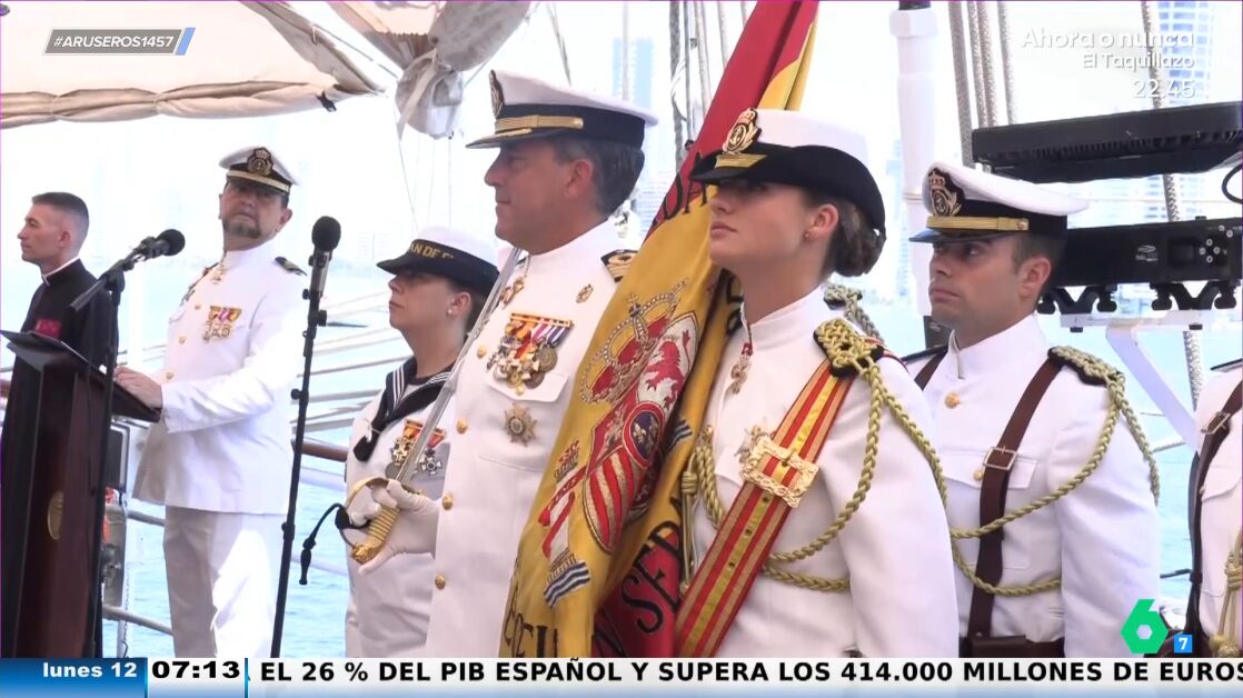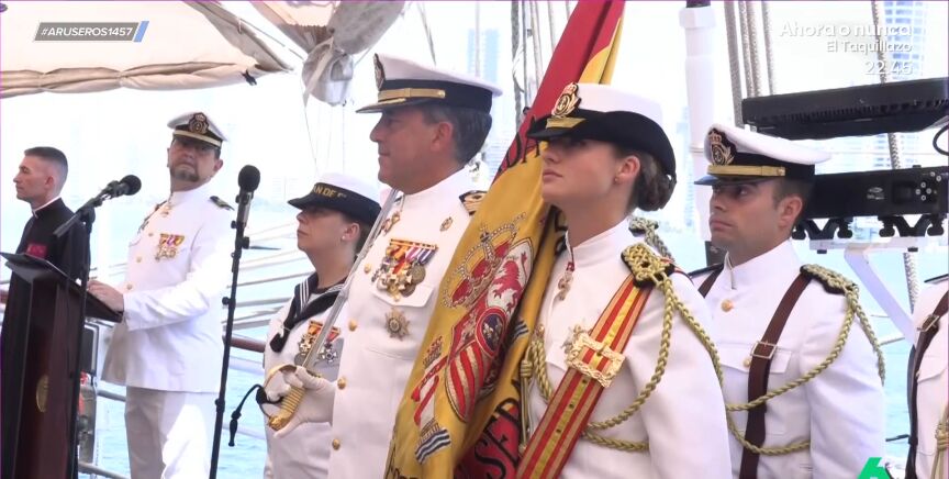 "Yo sigo pensando que a Leonor hay momentos en los que no puede ver porque la gorra se le cae", afirma Alfonso Arús al ver a la princesa en la jura de bandera de ElCano en Cartagena de Indias, Colombia.