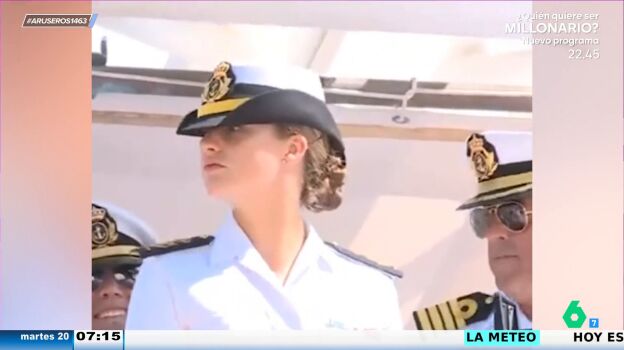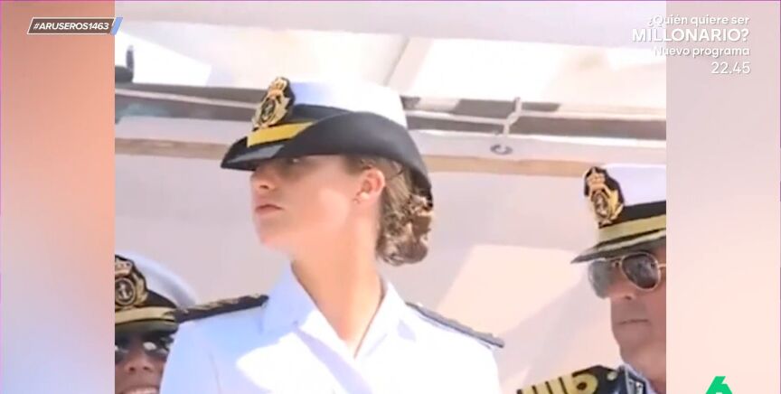 "He hecho un plano más detallado y no ve nada, o se baja el moño o no sé", reflexiona Tatiana Arús en el plató, donde Alfonso Arús alucina al ver el vídeo: "Un momento, ¿la princesa Leonor ha hecho la maniobra de atraque?, ¡pero si no ve nada!".