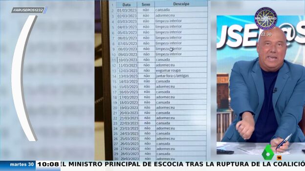 Alfonso Arús enseña en el plató de Aruser@s el vídeo viral sobre "el caso de un chico brasileño que ha elaborado un excel con todas las excusas que le da la chica para no tener sexo". "A la izquierda está la fecha y es curioso porque no hay ninguna repetida, así que el chico cuando le dan la negativa ya no insiste", destaca el presentador de Aruser@s, que afirma que él "a la tercera" ya ha pillado "la indirecta clara".