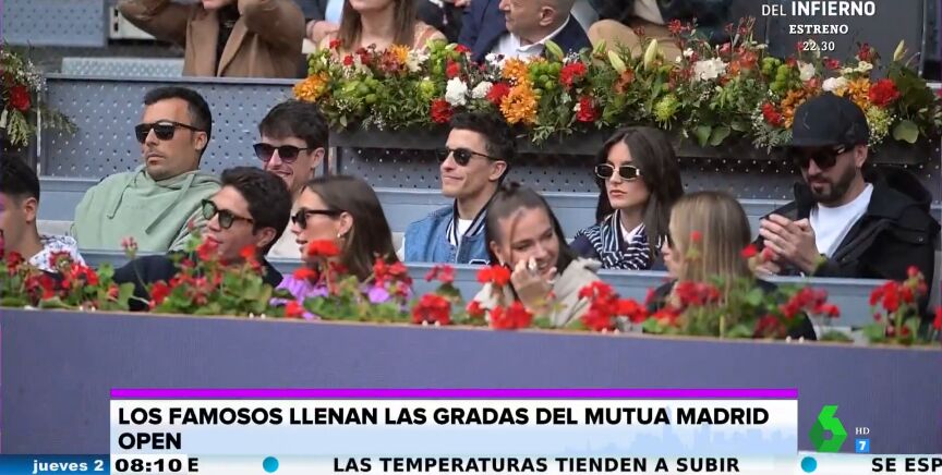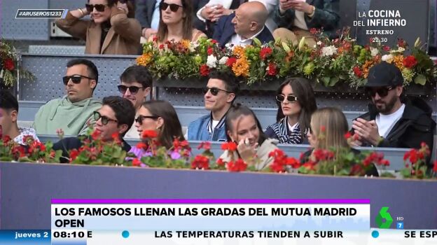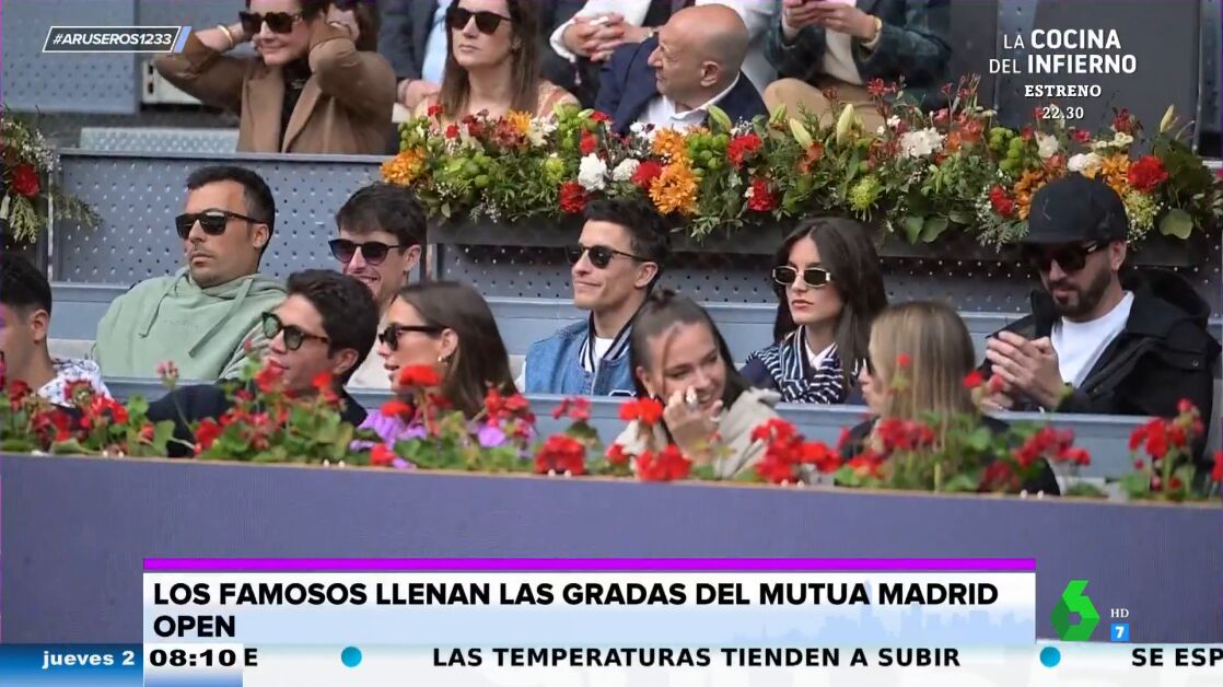 Tatiana Arús enseña en el plató de Aruser@s cómo "muchos rostros conocidos por metro cuadrado se han dado cita en la Caja Mágica". Por ejemplo, como se puede ver en el vídeo principal de esta noticia, los influencers María Pombo con su marido, Pablo Castellano, Laura Escanes, MeryLoves estaban en primer fila del partido de Carlos Alcaraz, mientras que detrás de ellos se encontraban los pilotos de MotoGP Marc y Álex Márquez junto a la novia del primero, la también influencer Gemma Pinto.