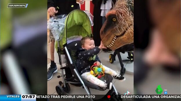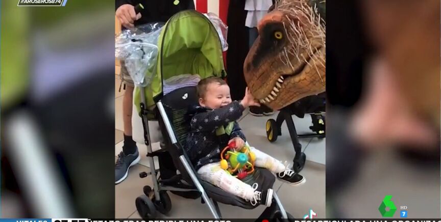 Su aspecto temible, su gran tamaño y sus enormes dientes no fueron suficientes para sembrar el pánico en este bebé, que lejos de asustarse, se divierte con la presencia de esta persona disfrazada de dinosaurio e incluso le llega a ofrecer jugar con su pelota.