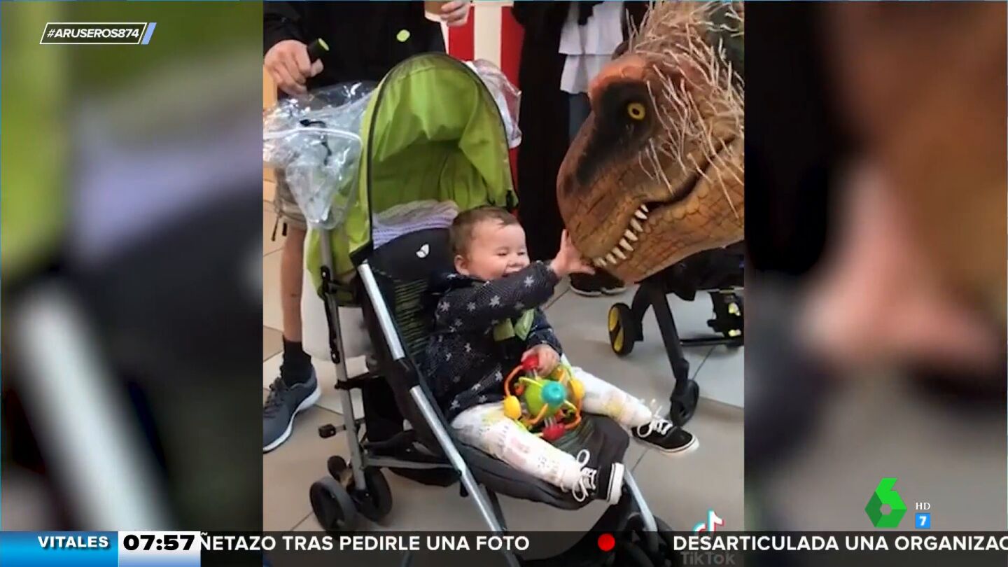 Amistad jurásica: la increíble reacción de un bebé cuando conoce a un 'dinosaurio'