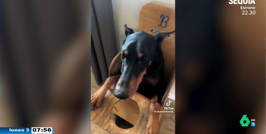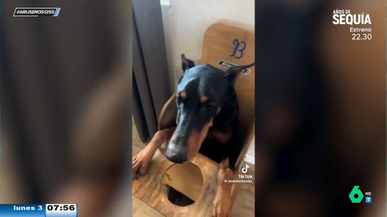 "El perro que sabe perfectamente sentarse en la trona", destaca Alfonso Arús, que añade que el dóberman tiene "clarísimo" lo que tiene que hacer para poder comer. Cuando llega la hora el perro se acerca hacia la trona, abre la puerta y se sienta dentro para que le sirvan la comida.