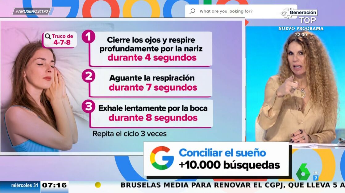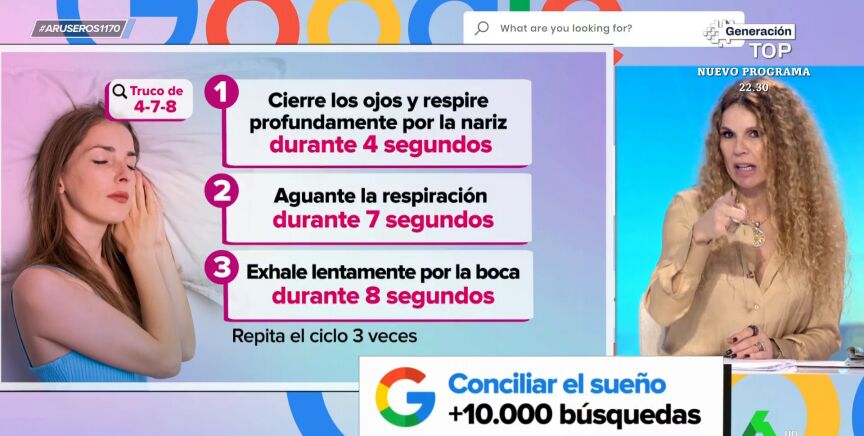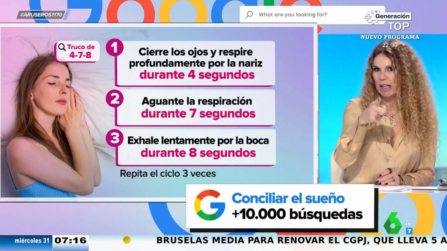 "Primero, tienes que ponerte en una posición cómoda. Esto es obvio. Luego tienes que respirar profundo durante cuatro segundos, aguantar la respiración durante siete y exhalar lentamente por la boca, haciendo un sonido de silbido, durante ocho. Esto lo repites tres veces", explica Hans Arús en Aruser@s acerca de este método para dormir, el truco denominado 4-7-8.