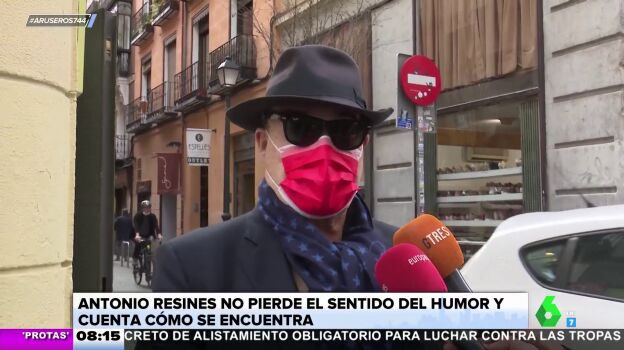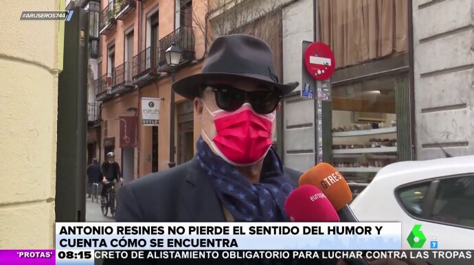 En el vídeo que acompaña a la noticia pueden verse las declaraciones de Resines, que salió a la calle ataviado con un sombrero, unas oscuras gafas de sol y una llamativa mascarilla roja. "Estuve 38 horas en coma, no me he enterado muy bien, pero sé que la gente ha estado muy pendiente y eso es una alegría", explicaba el actor ante los micrófonos de los periodistas.