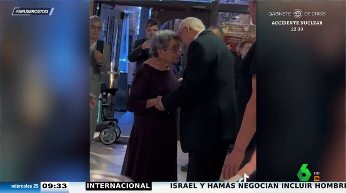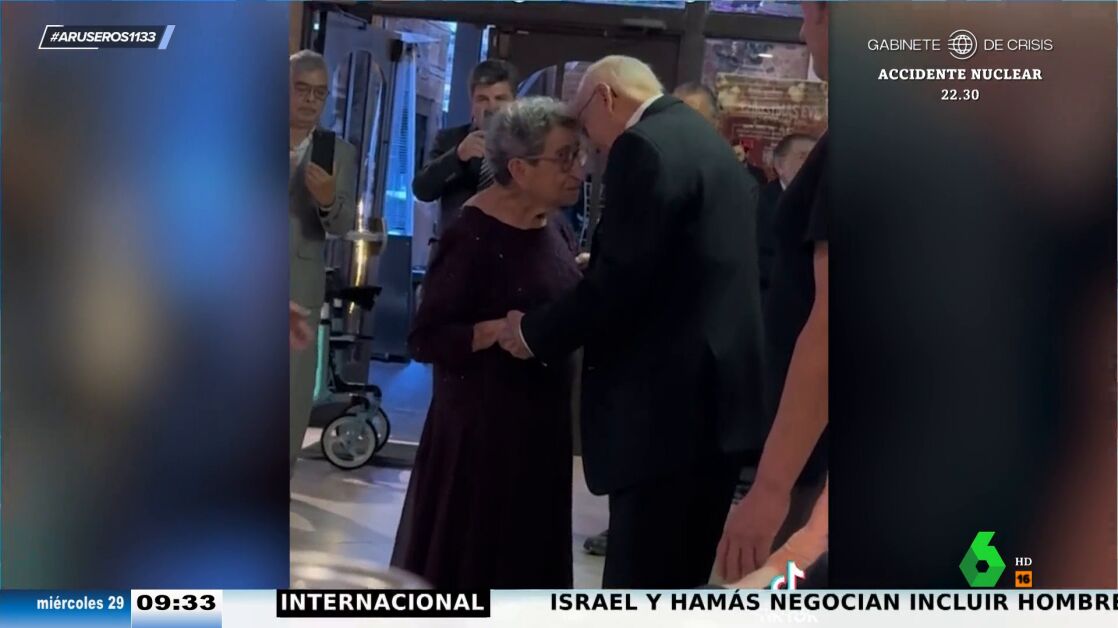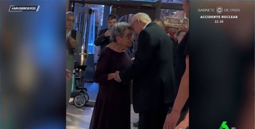 "No se separan ni un momento, se cogen de las manos, se muestran su cariño delante de todos los invitados... es una estampa absolutamente sensacional", dice con admiración Alfonso Arús al ver a esta pareja de ancianos celebrar su 70 aniversario de boda . "Aquí no son los 70 años de matrimonio, sino las siete décadas de amor y complicidad que tienen", comenta Angie Cárdenas, al borde de las lágrimas. "¡Qué romanticismo hay en esta pareja!".