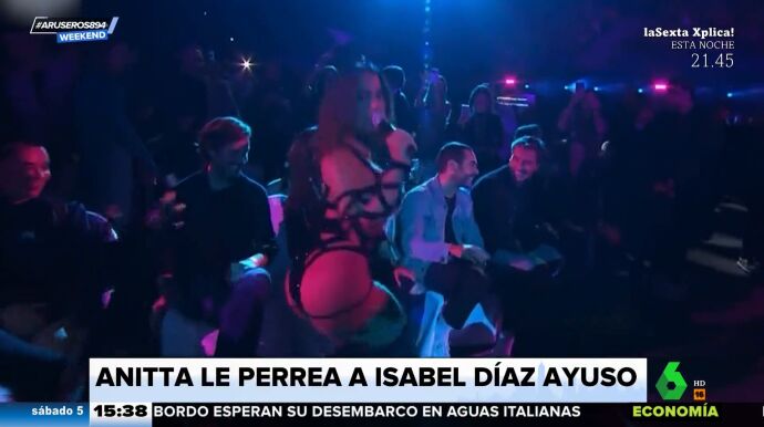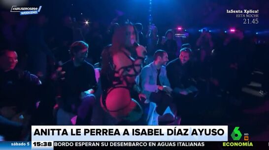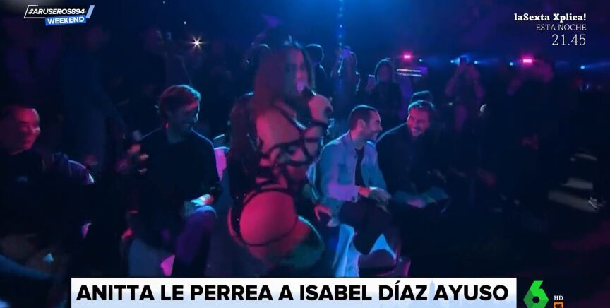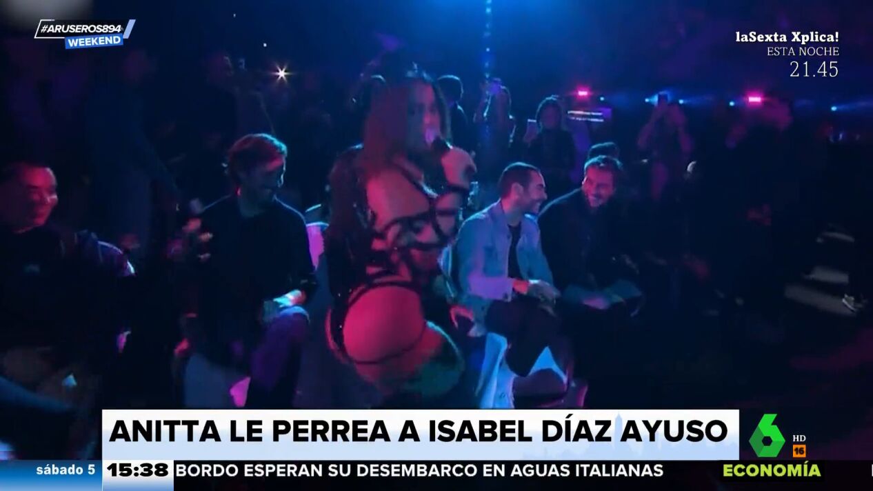 La entrega de premios de Los40 Music Awards 2022 tuvo unas protagonistas indiscutibles (además de Rosalía): la cantante Anitta y la presidenta de la Comunidad de Madrid, Isabel Díaz Ayuso. Como recoge este vídeo de Aruser@s Weekend, la brasileña bajó del escenario para bailar 'perreando' de manera muy sensual delante de Ayuso, quien tímidamente se animó a moverse en la silla y hasta a llevarse las manos a la cabeza. El baile de Larissa de Macedo Machado, más conocida como Anitta, fue un momento memorable que se hizo viral enseguida. Los Aruser@s creen que quizás todo era una estrategia para ganarse a la presidenta y poder actuar en Madrid en las próximas fiestas.