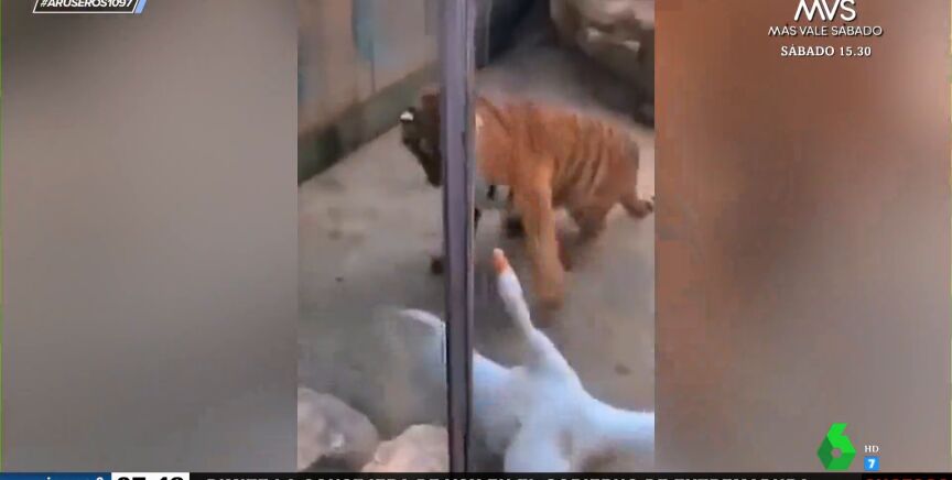 Así le planta cara y casi le da una paliza una oca a un tigre