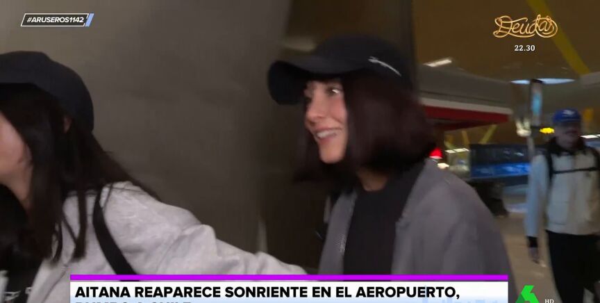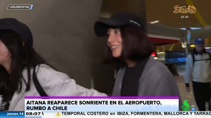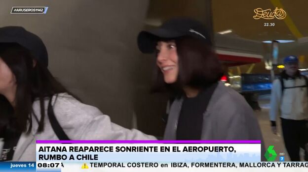 Aitana ha vuelto a reaparecer en el aeropuerto, esta vez, para viajar a Chile por su gira Alpha Tour. Allí, los reporteros le ha preguntado por su estado tras romper con Sebastián Yatra: "Personalmente, ¿cómo estás?, ¿curando un poco las heridas?". "Estoy trabajando mucho y muy feliz", destaca la artista, que no puede evitar reírse ante la pregunta de la reportera.