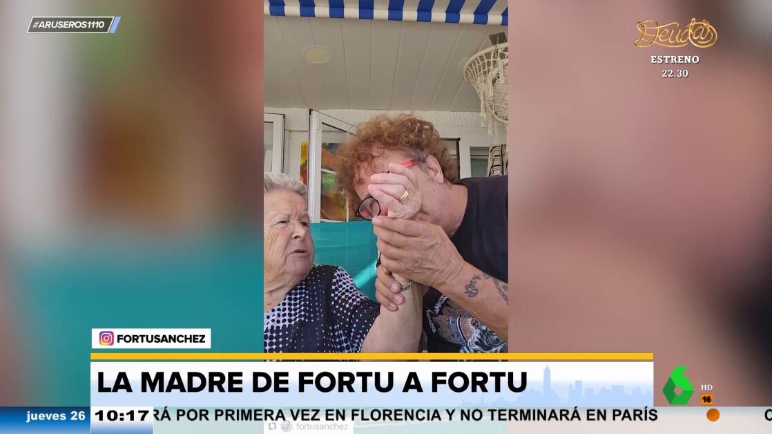 Alfonso Arús enseña en el plató de Aruser@s el "zasca de la madre de Fortu" a su hijo cuando están grabando un vídeo. En ese momento, la mujer cuenta a su hijo que le duele mucho la muñeca. "Espera, que te lo voy a curar, mira", dice Fortu mientras coge el brazo de su madre y comienza a darle besos mientras dice "sana, sanita".