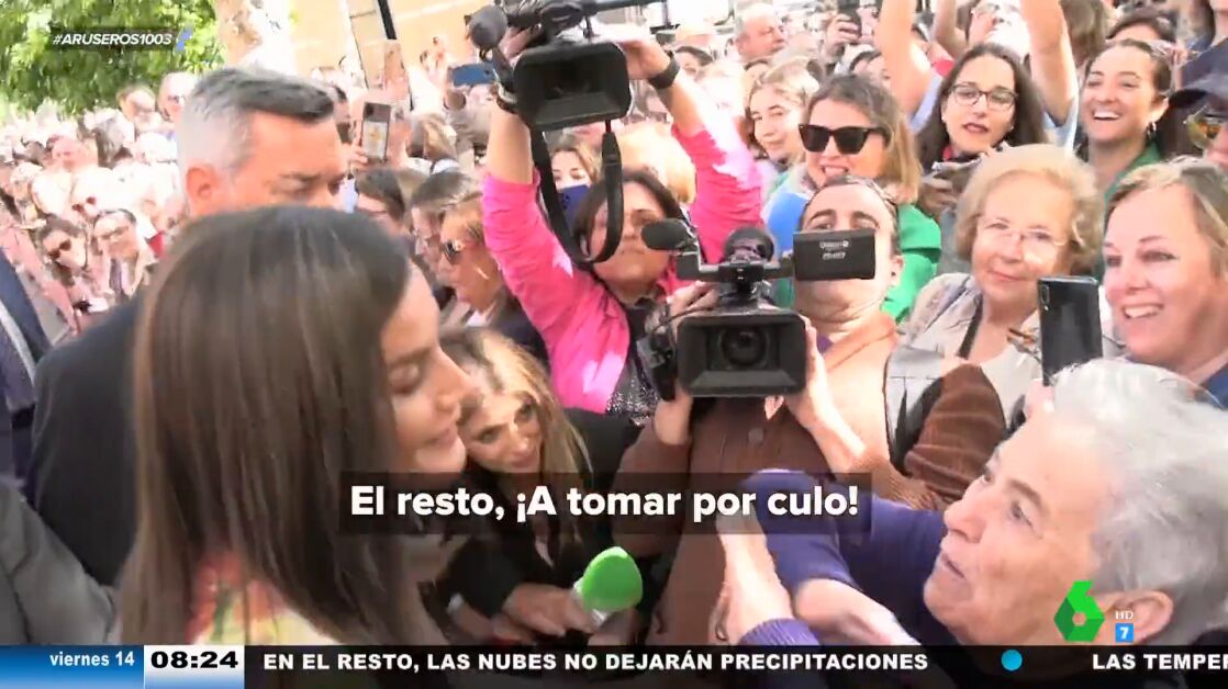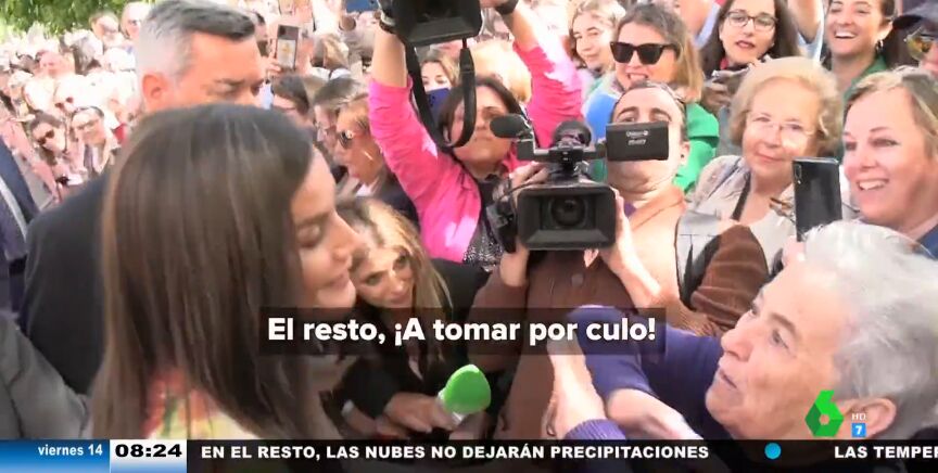 "¡Doña Letizia! La quiero mucho, a su marido y a sus hijas, ¡el resto a tomar por culo!", destaca la señora a la reina Letizia, cuya reacción viral puedes ver en este vídeo de Aruser@s.