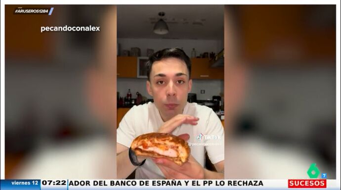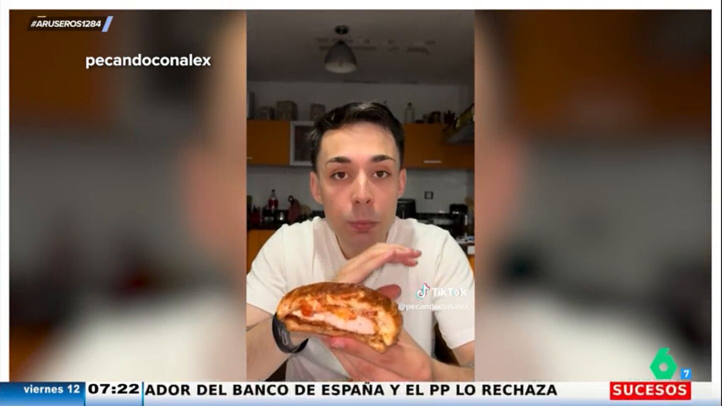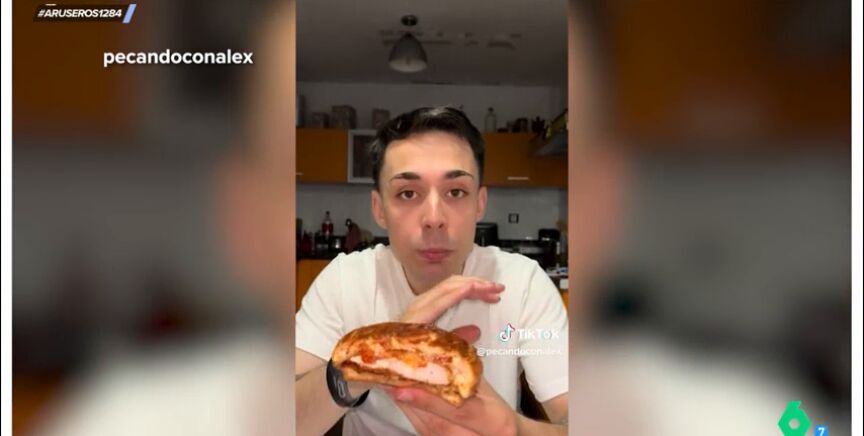 Hans Arús enseña en el plató de Aruser@s un vídeo viral del tiktoker '@pecandoconalex' en el que prueba, por primera vez, la hamburguesa viral de la colaboración de Dabiz Muñoz con Burger King. "¡Joder, la pinta que tiene!", destaca el joven al ver la hamburguesa, que explica que lleva "pollo crujiente, pepinillos y salsa tártara". Además, el tiktoker alucina con el pan: "Fijaos en el pan que es como un croissant".