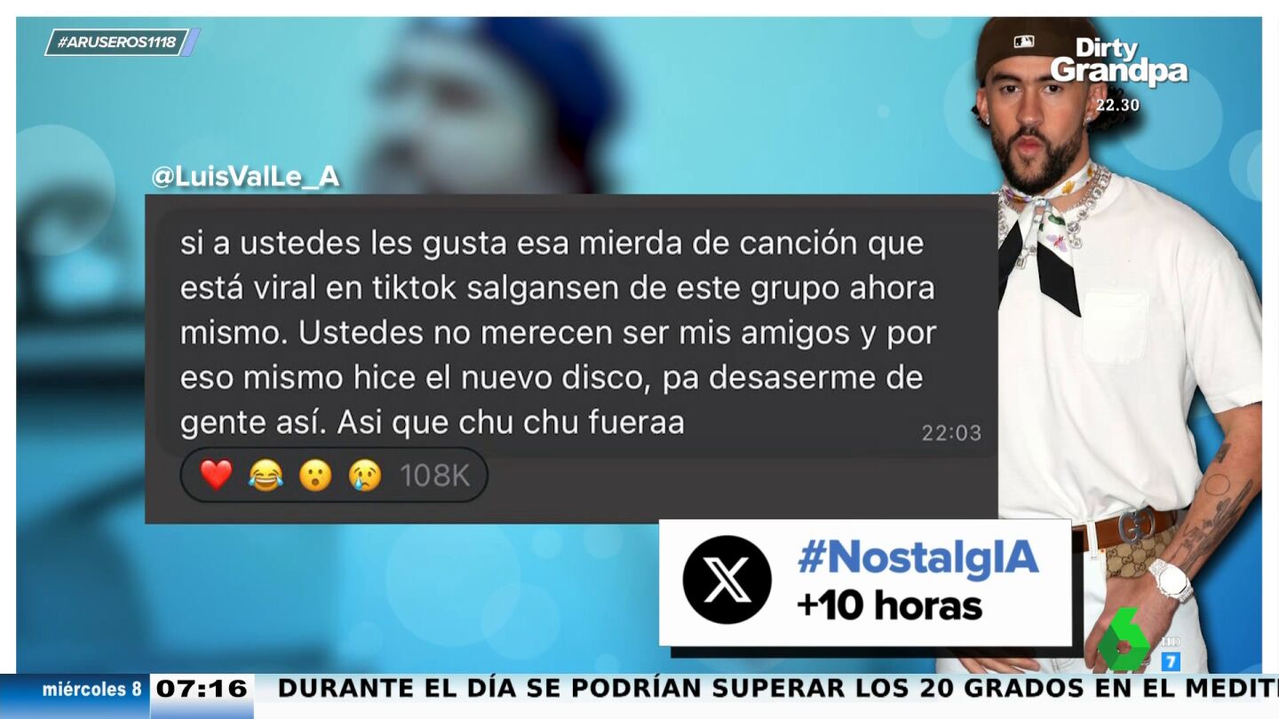 Los colaboradores de Aruser@s escuchan con atención cómo suena este tema generado por IA y no pueden más que alucinar con el resultado. "Podríamos decir que el ritmo y la letra es muy Bad Bunny", apunta Hans Arús. "Yo no le veo ninguna diferencia con cualquiera de sus éxitos", reconoce Alfonso Arús.