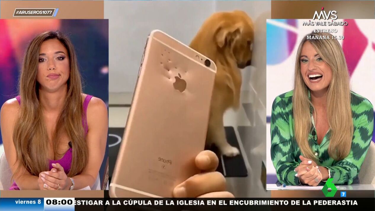 Cuando su dueño le pone el móvil encima de la cabeza, el perro comienza a gimotear, pero no abandona su postura. "No quiere que se sepa que ha sido él y se hace el inocente", comenta Alfonso Arús tras ver el divertido vídeo de este momento, emitido en Aruser@s.