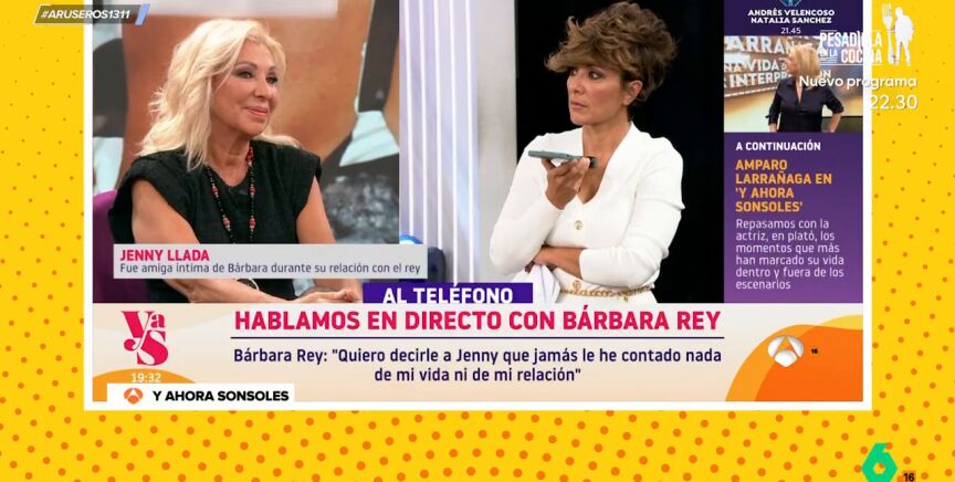 Bárbara Rey ha llamado en directo al programa 'Y ahora, Sonsoles', de Antena 3, tras ver cómo Jenny Llada, su antigua amiga, hablaba en pleno directo sobre su vida tras salir a la luz las polémicas fotografías con el rey Juan Carlos. "Eso lo ha sacado ella poco a poco, de una cosa, de otra y de otra", critica Bárbara Rey, que manda un tajante mensaje a Jenny Llada: "Por favor, a ver si puedes ir alguna vez a algún programa a hablar de tu vida".