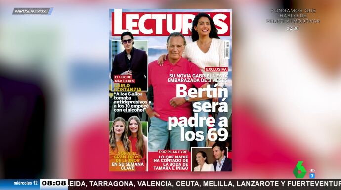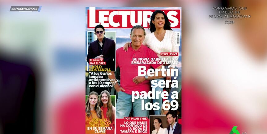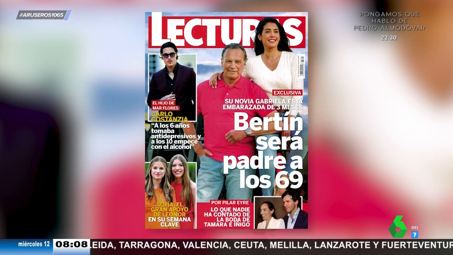 Alfonso Arús enseña en el plató de Aruser@s la noticia bomba que lleva la revista Lecturas en su portada, donde aparece una imagen deBertín Osborne y su novia Gabriela en la que se puede leer que el cantante volverá a ser padre a los 69 años. Y es que la joven está embarazada de tres meses.