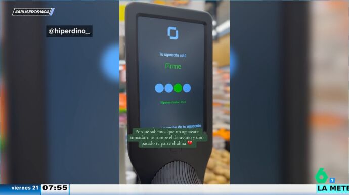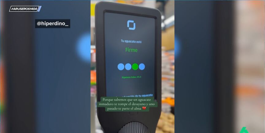 "Se acabó tener que manosear la fruta en el supermercado, ¡atención al invento que ha lanzado HiperDino!", exclama Alfonso Arús, que muestra la solución tecnológica que han implementado en la tienda para poder medir la madurez de los aguacates. Algo que para muchos usuarios sigue siendo un auténtico quebradero de cabeza.