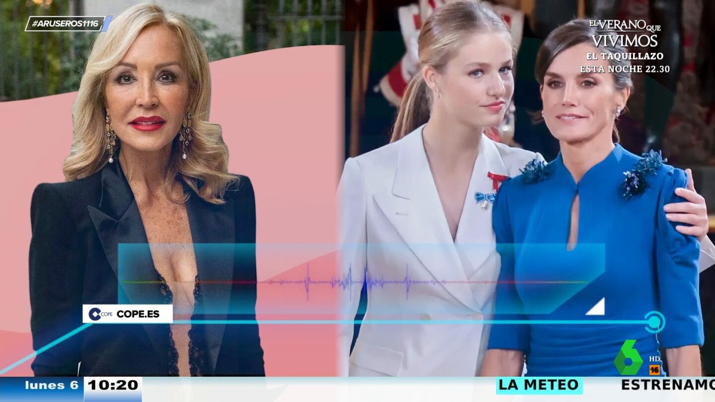 Alfonso Arús muestra en el plató de Aruser@s la crítica de Carmen Lomana al peinado de la reina Letiziaen la jura de la Constitución de la princesa Leonor. "A mí no me gusta con ese pelo, a mí me gusta muchísimo más cuando lleva una coleta atrás, como llevaba la niña", explica Lomana, que critica "el peinado tan pegado con la cara que tenía enfadadísima".