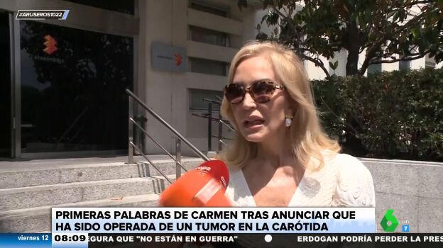 "Me estoy recuperando fenomenal", cuenta Carmen Lomana, que afirma que le han quitado "una pelota" y destaca que con el vendaje en la cabeza parecía "que venía de la guerra". Preguntada sobre qué tipo de tumor es, Carmen Lomana afirma que aunque lo sabrá el miércoles, "el 90% es benigno".