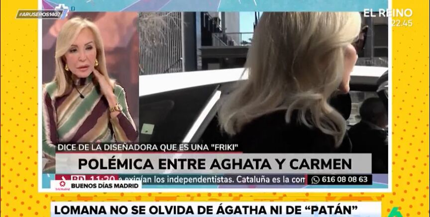 Carmen Lomana no desaprovecha ninguna ocasión para cargar de manera pública y en televisión contra su archienemiga Ágatha Ruiz de la Prada. "Yo a ella no la necesito ni forma parte de mi vida", asegura en el programa de Telemadrid 'Buenos días Madrid', como vemos en este fragmento rescatado en Aruser@s. "Lo más terrible que te puede pasar es que alguien que has invitado a tu casa tenga esa hipocresía, esa deslealtad", dice con amargura.