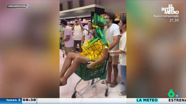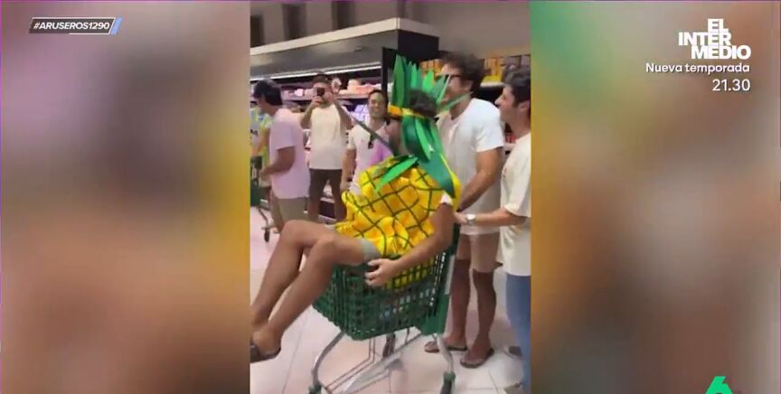El supermercado, que se ha convertido en uno de los sitios predilectos para ligar en España por culpa de una moda que ha arrasado en redes, ahora es escenario de momentos tan rocambolescos como el que vemos en estas imágenes. "Los trabajadores están retirando las piñas de 19h a 20h, porque es una locura", cuenta Alba Gutiérrez.