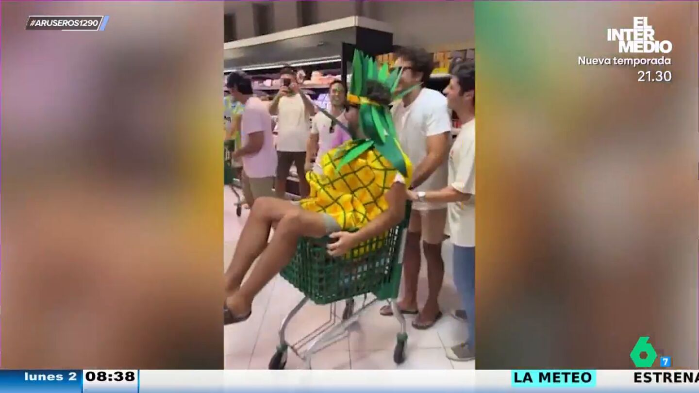 Vestido de piña, con un carrito de la compra y rodeado de sus amigos. Así es como celebra el chico que protagoniza este vídeo viral emitido en Aruser@s su despedida de soltero en Mercadona. "Pero no va boca abajo", se queja Angie Cárdenas haciendo referencia a los diferentes códigos que los internautas han establecido para encontrar una cita en este lugar.