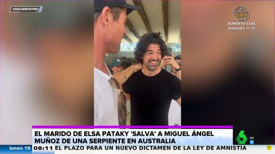 "¿Es un héroe el marido de Elsa Pataky salvando a Miguel Ángel Muñoz de una serpiente?", pregunta Alfonso Arús en el plató de Aruser@s, donde Tatiana Arús enseña el vídeo viral: "Cuando vas a casa de Elsa y Chris te pueden suceder cosas como esta".