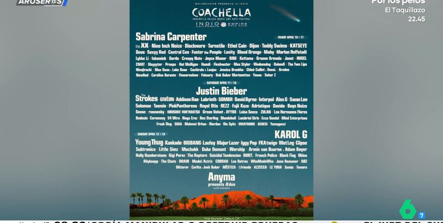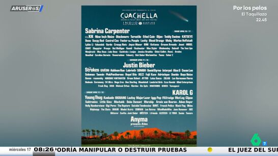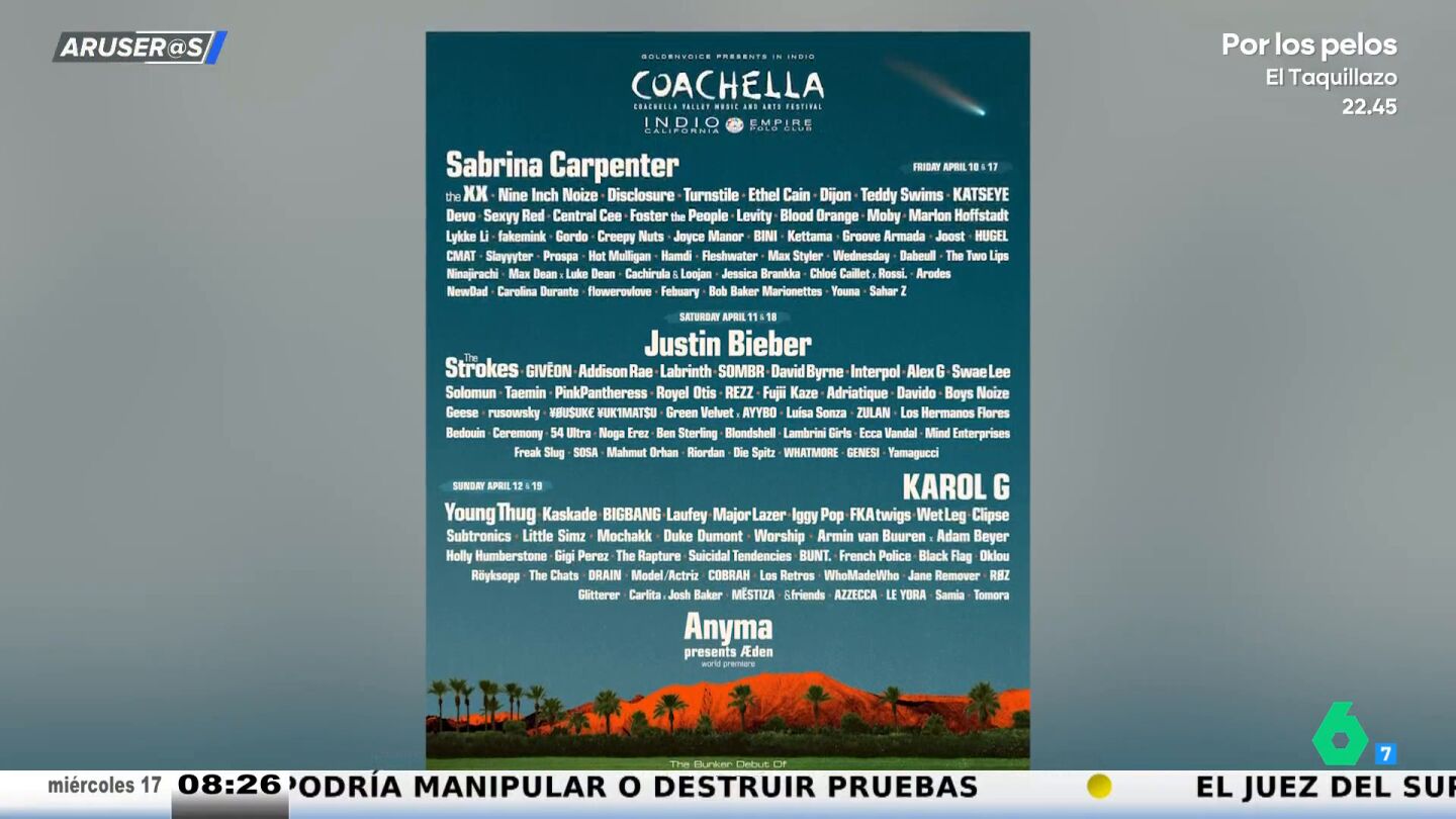 El Festival de Coachella ya ha sacado su cartel oficial en el que anuncia los artistas que estarán en el festival en 2026, que se celebra en la localidad californiana de Indio. "Tenemos tres cabezas de cartel muy potentes", destaca Tatiana Arús, que explica que al para el viernes 10 de abril está establecida la actuación de Sabrina Carpenter.