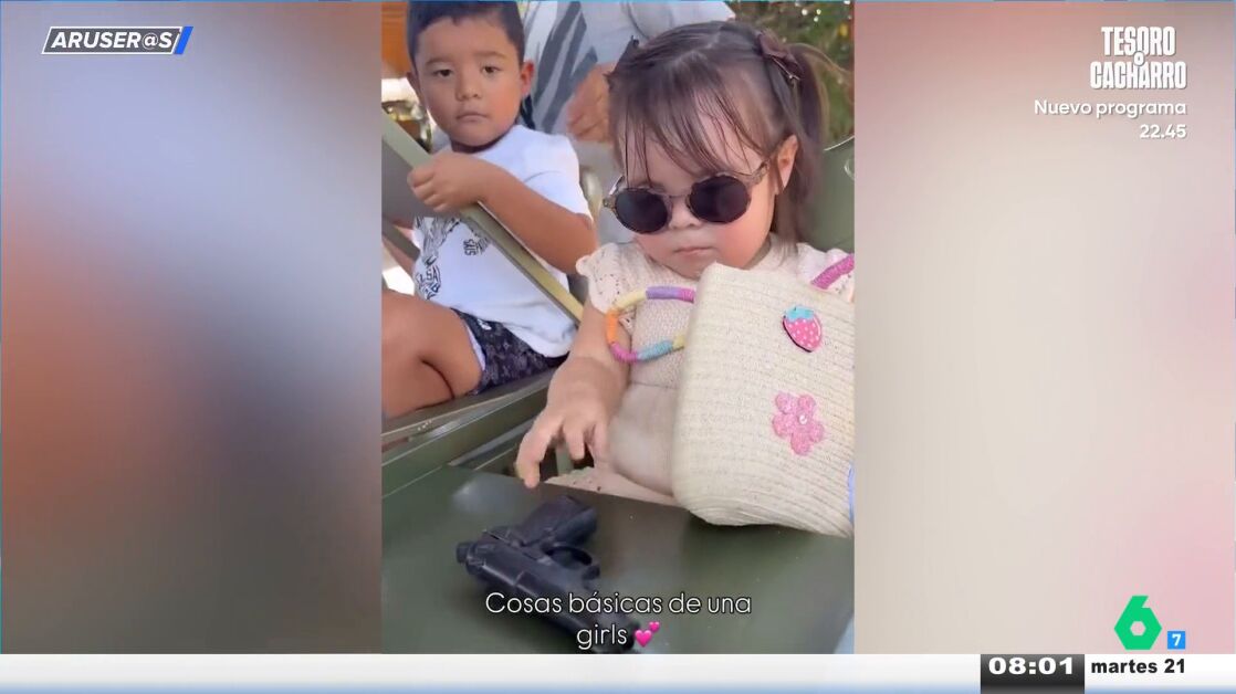 La pequeña, con su vestidito y unas grandes gafas que le cubren la cara, ha mostrado a sus seguidores los "básicos" que lleva en su bolso: una pistola de juguete, varios móviles falsos y un esmalte de uñas.