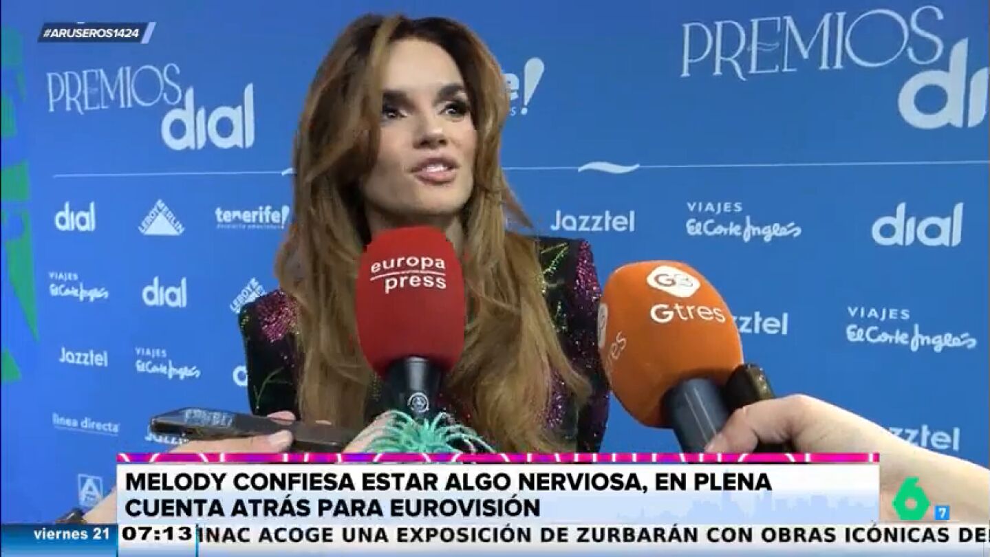 Melody ha confesado sus nervios para Eurovisión en los Premios Cadena Dial 2025, donde ha desvelado que tiene "ese gusanillo". "No falta nada", ha destacado la artista sobre su actuación en Eurovisión con la que representará a España con 'Esa diva' el próximo 17 de mayo.