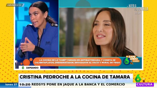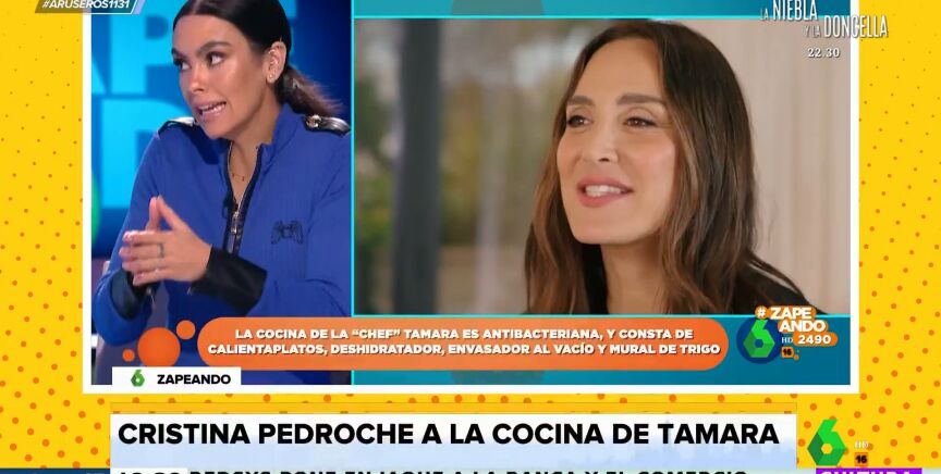 Alfonso Arús enseña en el plató de Aruser@s el 'dardo' que le ha lanzado Cristina Pedroche a Tamara Falcó en Zapeando al analizar la nueva cocina de la marquesa de Griñón en su nueva casa, que ha presentado en un reportaje en la revista 'AD'. "Yo veo fallos", afirma Cristina Pedroche, que destaca que "ella que es chef necesita una campana grande": "¿Dónde está la campana ahí?, si cocina ella de verdad se va a llenar todo de humo".