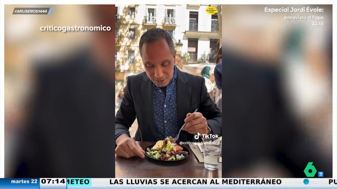 "El miniplato de tres tapas que ponen a los guiris", comenta con estupor mientras lo muestra a cámara. El jamón, además de horrible, es de bolsa, al igual que la ensalada. El pan es indescriptible. Como un valiente, se atreve a aventurarse con el plato de paella. "No es de las peores", reconoce sorprendido.