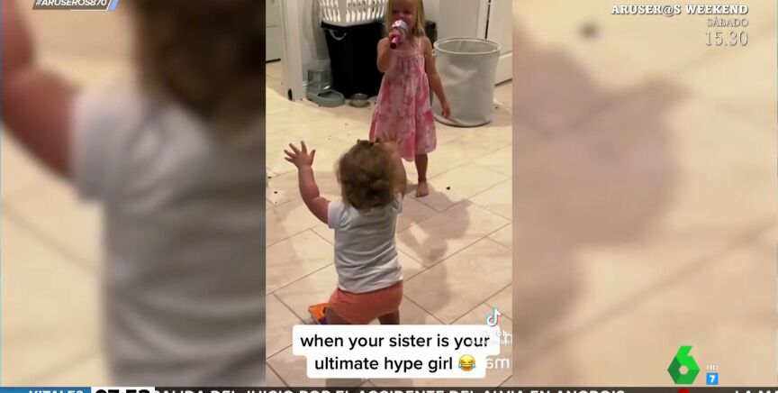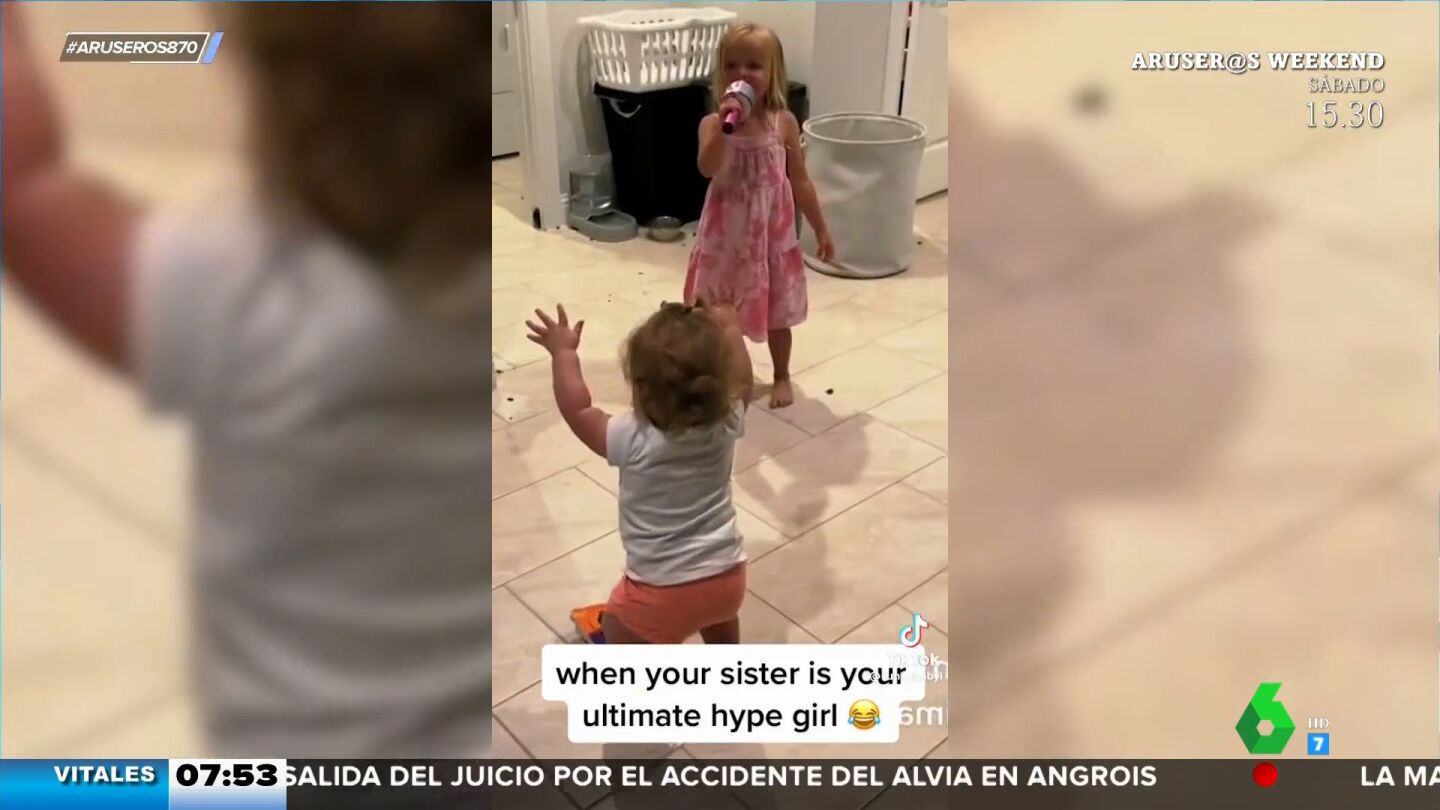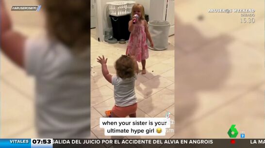 En este entrañable vídeo viral, una pequeña apoya a su hermana como si fuera una diva de la música, a pesar de las escasas dotes como cantante de la niña. Una auténtica fan que se entrega como pocos.