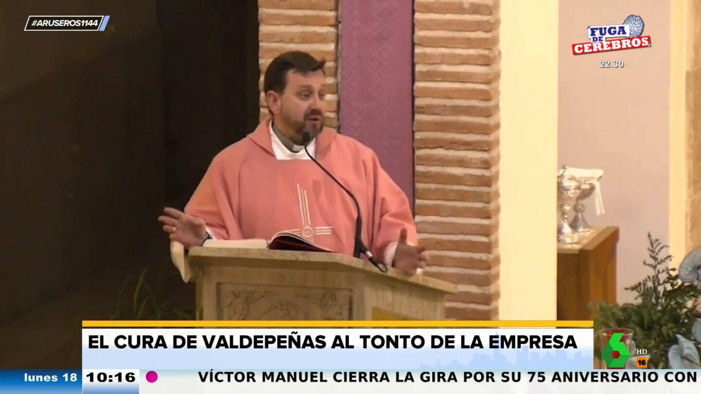 Alfonso Arús enseña en el plató de Aruser@s un vídeo en el que el cura de Valdepeñas reflexiona sobre las cenas de empresa. "Siempre hay un compañero del trabajo que te parece tonto, o a lo mejor te parece tonta toda la plantilla", afirma el cura en plena misa.