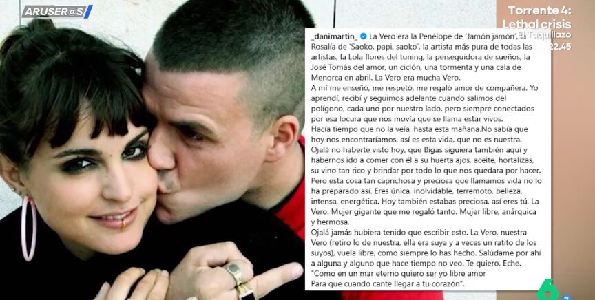 "La Vero era la Penélope de 'Jamón, jamón', la Rosalía de 'Saoko, papi, saoko', la artista más pura de todas las artistas, la Lola Flores del tuning, la perseguidora de sueños, la José Tomás del amor, un ciclón, una tormenta y una cala de Menorca en abril. La Vero era mucha Vero", escribió en un post de Instagram, definiendo con estas cariñosas palabras a su amiga y acompañando el texto con una fotografía de ambos en 2006.