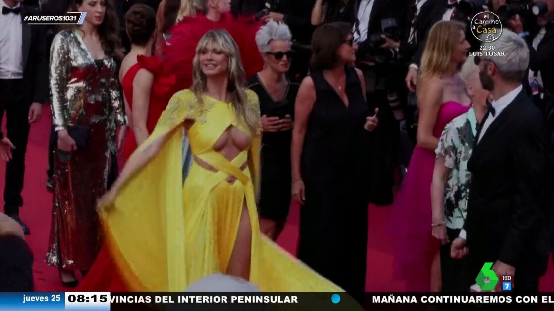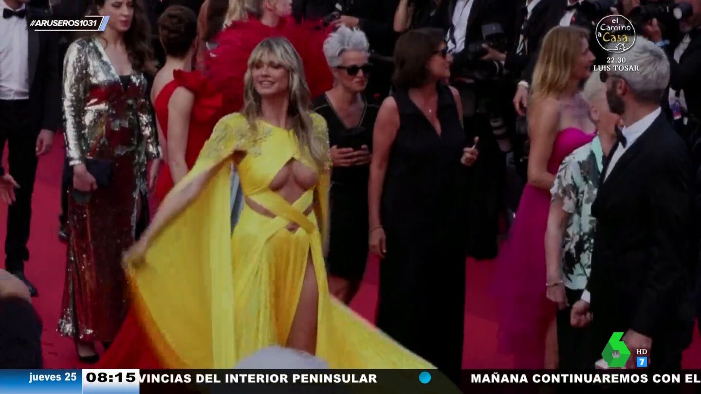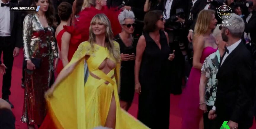 Heidi Klum ha eclipsado en Cannes con un vestido amarillo con capa y un atrevido escote. La combinación le ha jugado una mala pasada y es que al mover los brazos para enseñar la capa, se le ha visto un pezón.