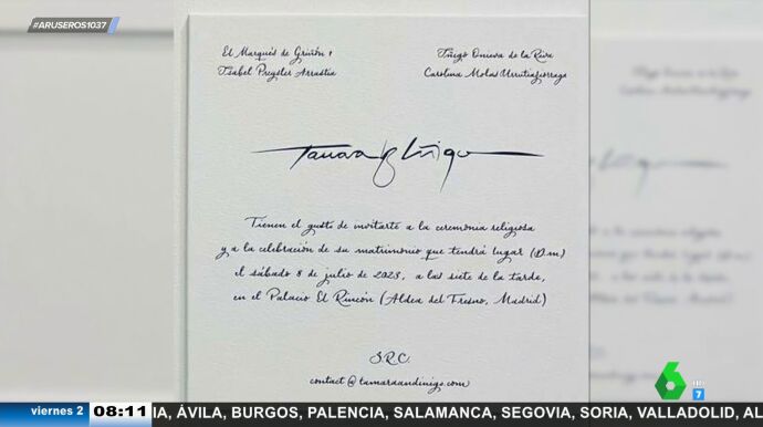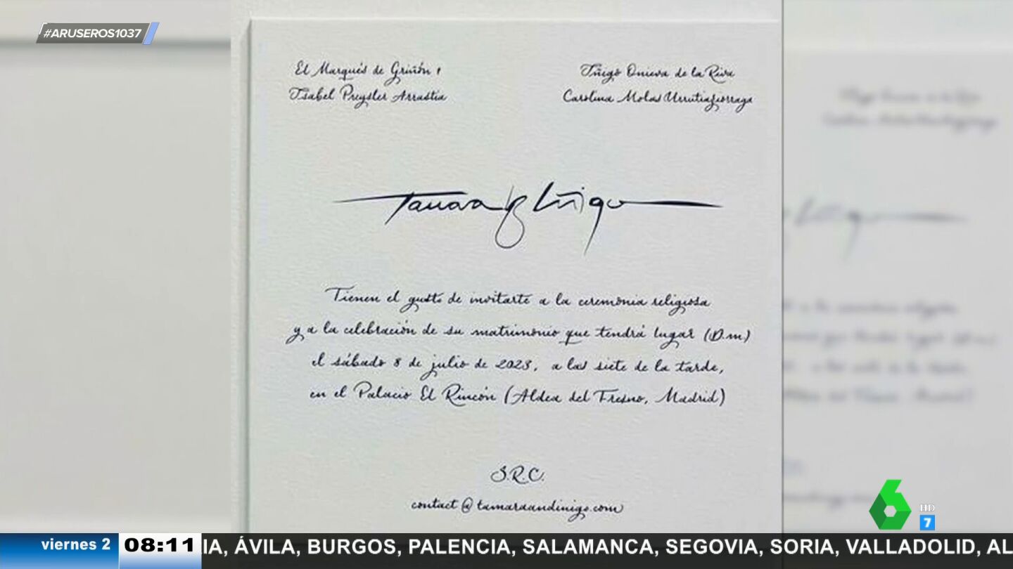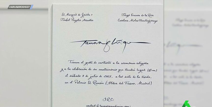 La colaboradora lee textualmente el contenido de la misma. "Tamara 'y' Íñigo tienen el gusto de invitarte a la ceremonia religiosa y a la celebración de su matrimonio que tendrá lugar el sábado 8 de julio de 2023 a las 19h en el Palacio del Rincón".
