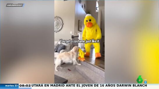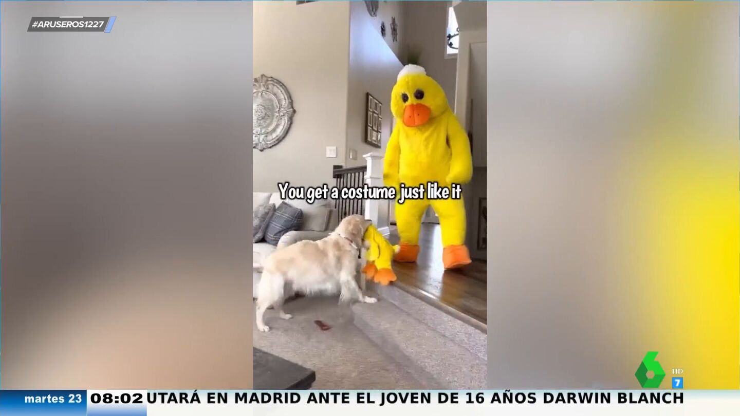 ¡Las aventuras de este pato y este perro están a punto de empezar! En este divertido vídeo viral somos testigos de la reacción del golden al ver a su dueño disfrazado del que es, sin duda, su peluche favorito.