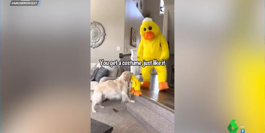 El peluche favorito del simpático golden retriever que protagoniza este vídeo viral emitido en Aruser@s es un pato y su dueño ha decidido darle una sorpresa. Para ello, se disfraza de su querido juguete, eso sí, a una escala mucho mayor. El perro no puede creerse lo que ven sus ojos y reacciona poniéndose contentísimo ante el 'milagro' que acaba de ocurrir.